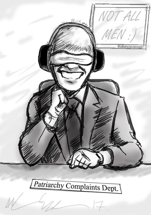 Had a funny conversation with a friend yesterday about where to complain about sexism. The patriarchy doesn’t exactly have a complaints department. It made me think of what that complaints department might look like, the answer being the above patriarchy cartoon! 😀 (I also wanted to try out my graphics tablet.)