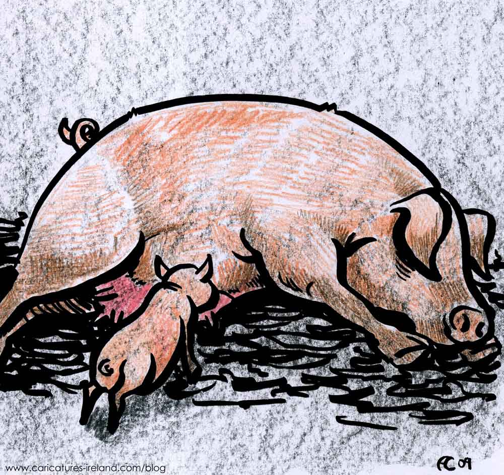 Pig cartoon. A cartoon of a pig (sow) lying down with piglet suckling. Image may be used non-commercially with a link back to my home page www.caricatures-ireland.com. For commercial use contact me below. Suggested tip for non-commercial use: €2