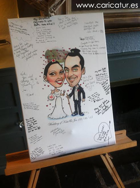 As well as drawing live caricatures for weddings I also supply caricature wedding signing boards. These are large colour caricatures of the couple that the wedding guests sign. My signing boards are available as A3 art mounted on an A1 board (right), or a 60X40cm canvas print on a wooden stretcher (left). They’re a great way of capturing your guests best wishes and will last a lifetime! You can order a caricature signing board here!