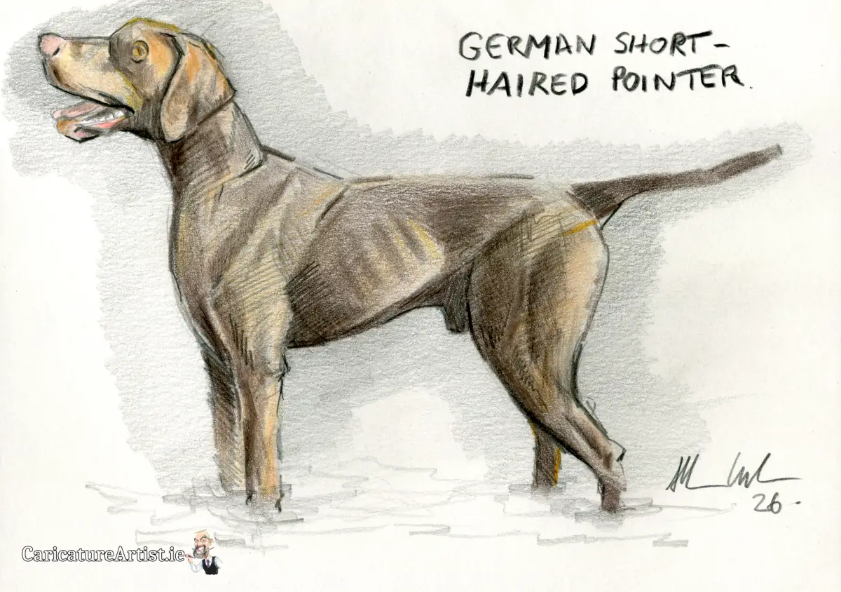 German Short-haired Pointer Dog Portrait: Drawing Every Dog is a new feature I’m a few weeks into now. This week it’s the turn of the German Short-haired Pointer, who’s next in the book after the German Long-haired Pointer. The German Short-haired Pointer was developed from the Spainish Pointer by adding Bloodhounds, Foxhounds, and English Pointers. Above is a portrait of the German Short-haired Pointer breed, drawn in pencil and colouring pencil, on A5 220gsm Windsor & Newton smooth surface cartridge. All works are for sale! You can make an enquiry below.