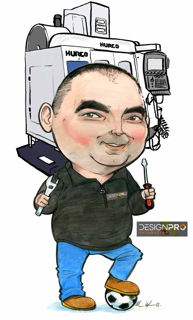 This caricature was commissioned for a work colleague in a company in Limerick. It was printed on canvas and signed by everyone before he left. The client emailed me photos of him and the Hurco machine he worked with (I have no idea what it does!) and then the artwork was scanned and printed on 60cmX40cm canvas by The Canvas Works printers in Kinsale. I got fantastic feedback from the client: