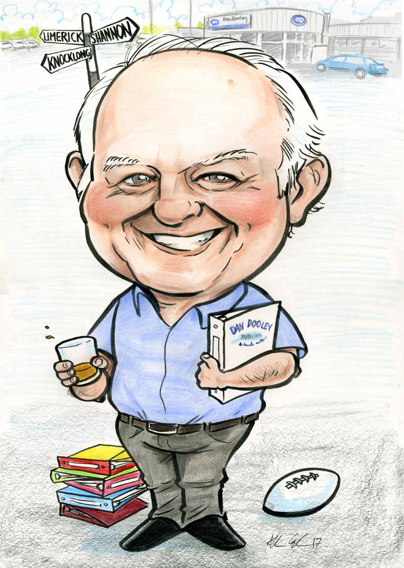 This retirement present caricature went out to a car dealership recently as a gift from the staff for all the years of service! It references his roll in the dealership and several important places to him, represented by the signpost in the background. I even included the car dealership! My caricatures are a unique gifts for retirements, completely designed from the ground up with your suggestions of hobbies, pets, careers, or other interests. I work from photos and in this digital age it’s usually quite easy to round up a few good photos without the subject knowing about it! You can see many more of my retirement caricatures here.