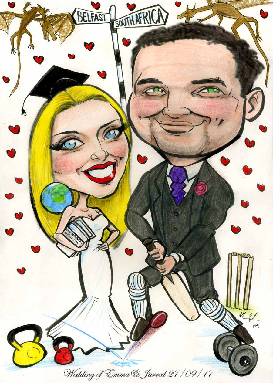 A recent canvas wedding signing board. These make a great alternative or addition to the traditional wedding guestbook (which can just sit on a shelf undisturbed for years!) Collect all your guests’ signatures and best wishes in one place, visible at the same time, with this piece of bespoke caricature art by Allan Cavanagh you can hang in your home before you even head off on honeymoon! My wedding signing boards are a fun and highly personalised way of capturing the fun of your big day. Printed on canvas and presented on a 40x60cm wooden stretcher that’s ready to hang. They can of course be framed too. Each wedding signing board comes with pens so once you order all you have to do is display it on the day.